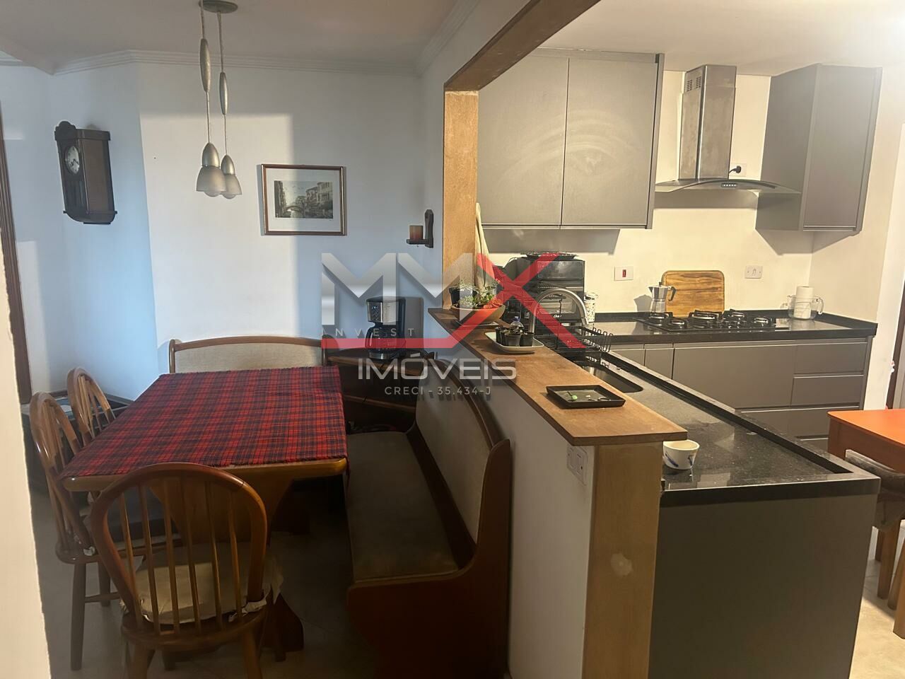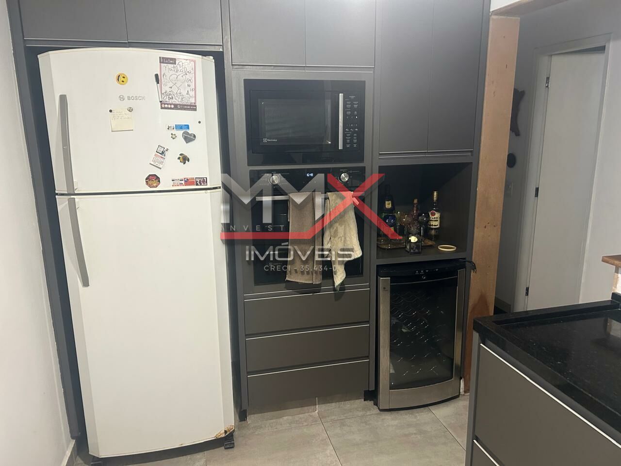 O imóvel conta com cozinha americana equipada com armários, integrada aos ambientes, além de adega climatizada e ar condicionado, proporcionando mais conforto no dia a dia.